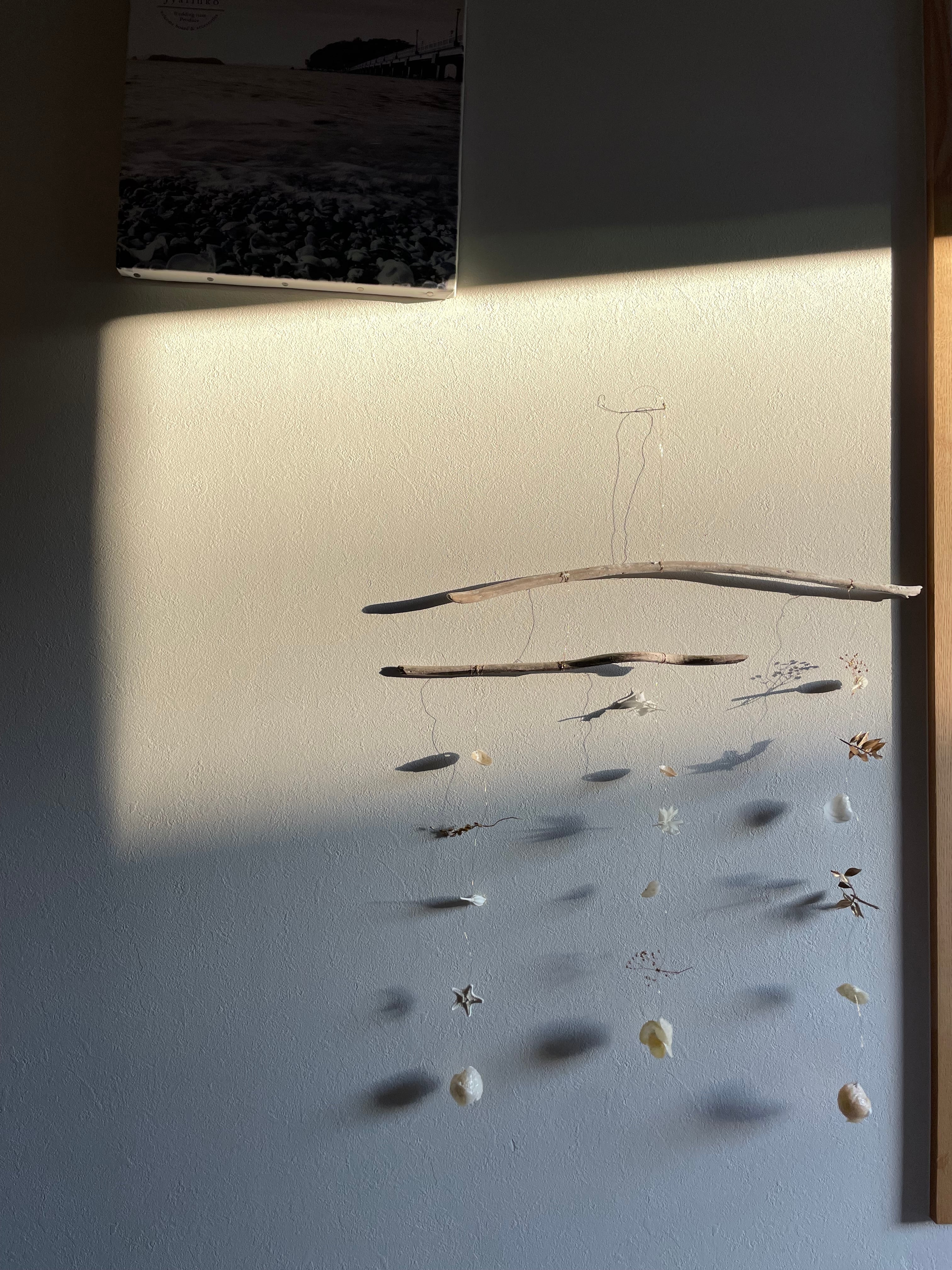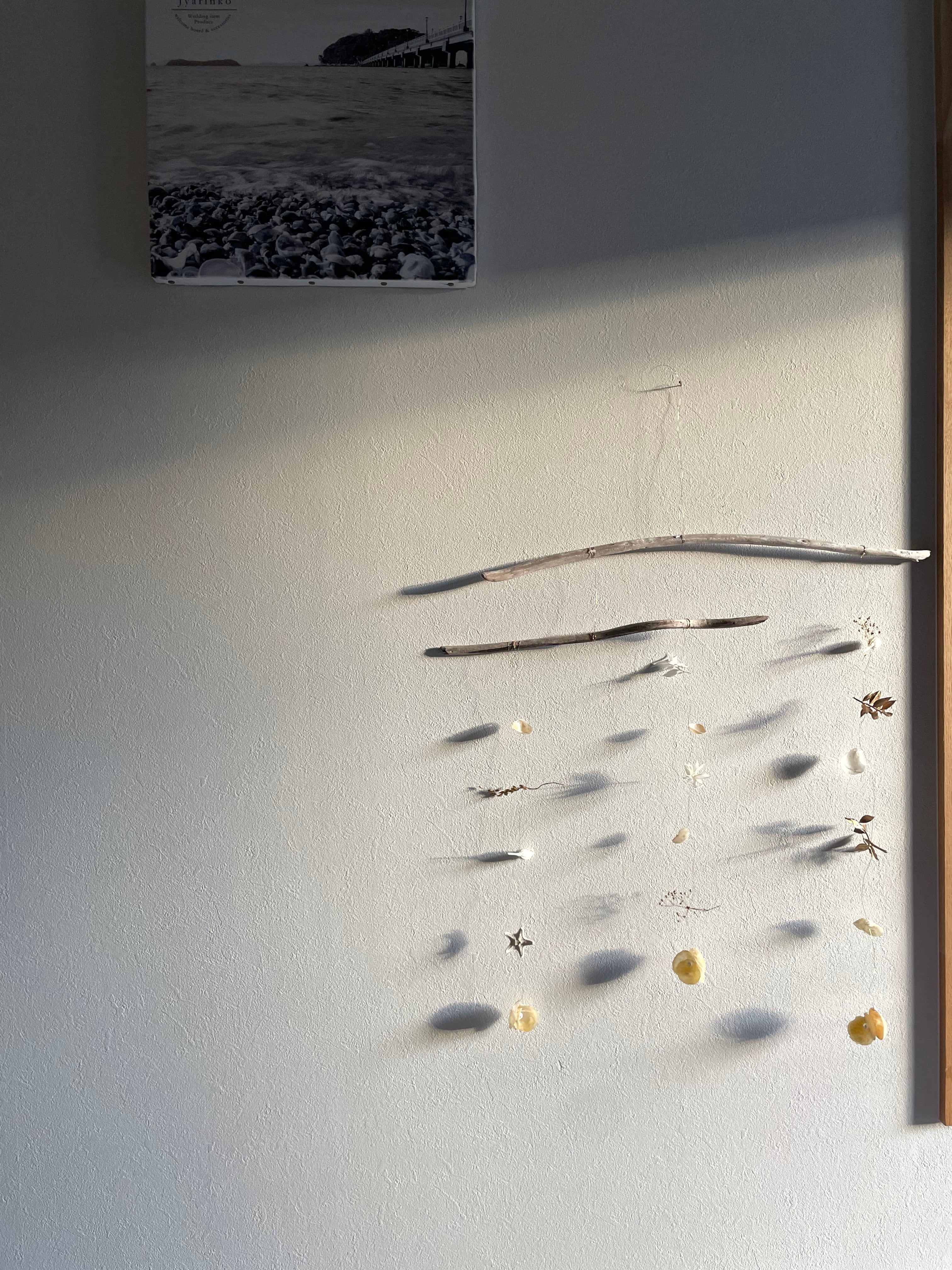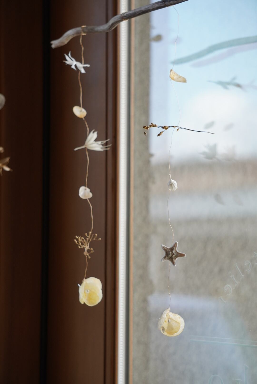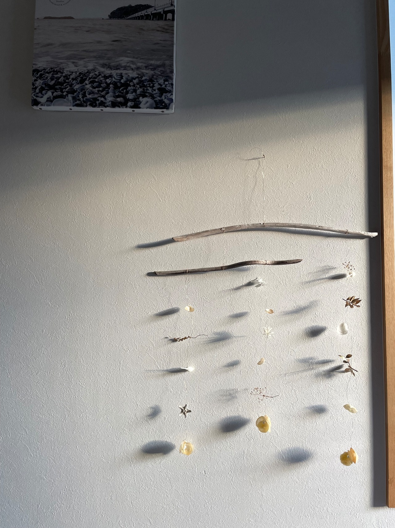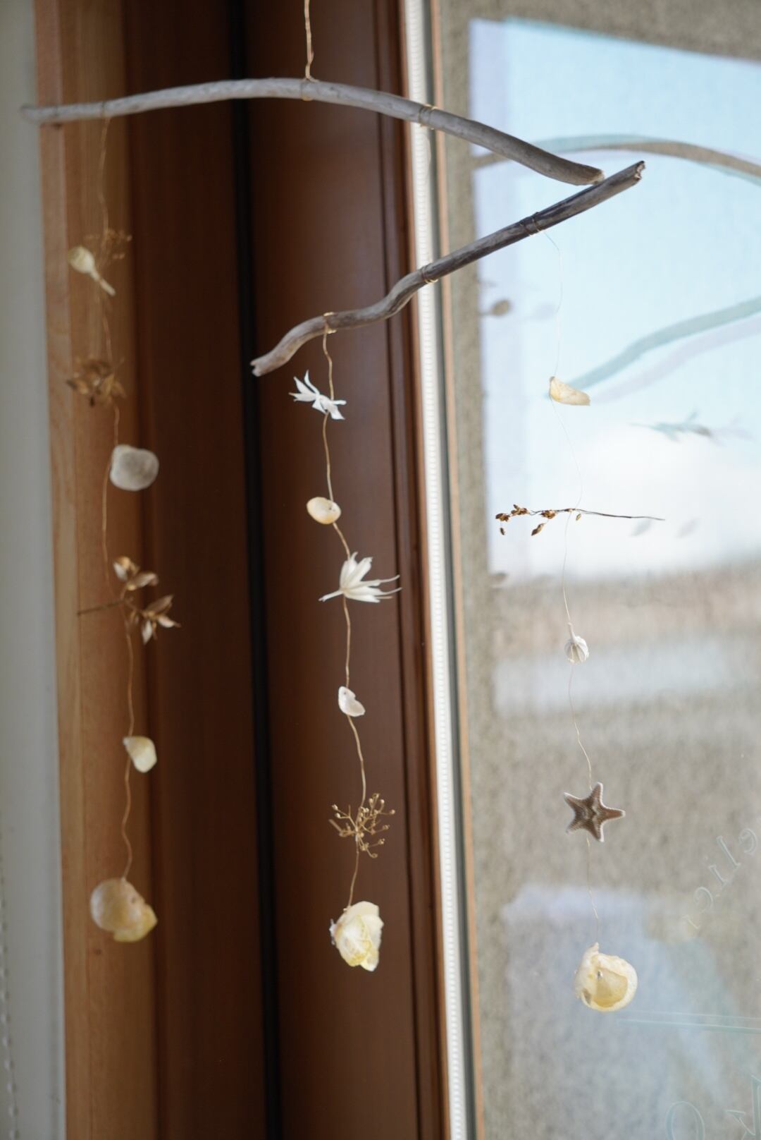 流木に貝殻やヒトデ、ドライフラワーなどが揺れる優しい色味のモビールです。