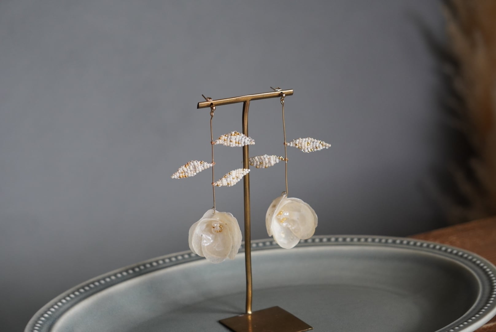 ホワイトの貝殻とガラスビーズで仕上げた繊細なリーフが組み合わさったアクセサリーです。