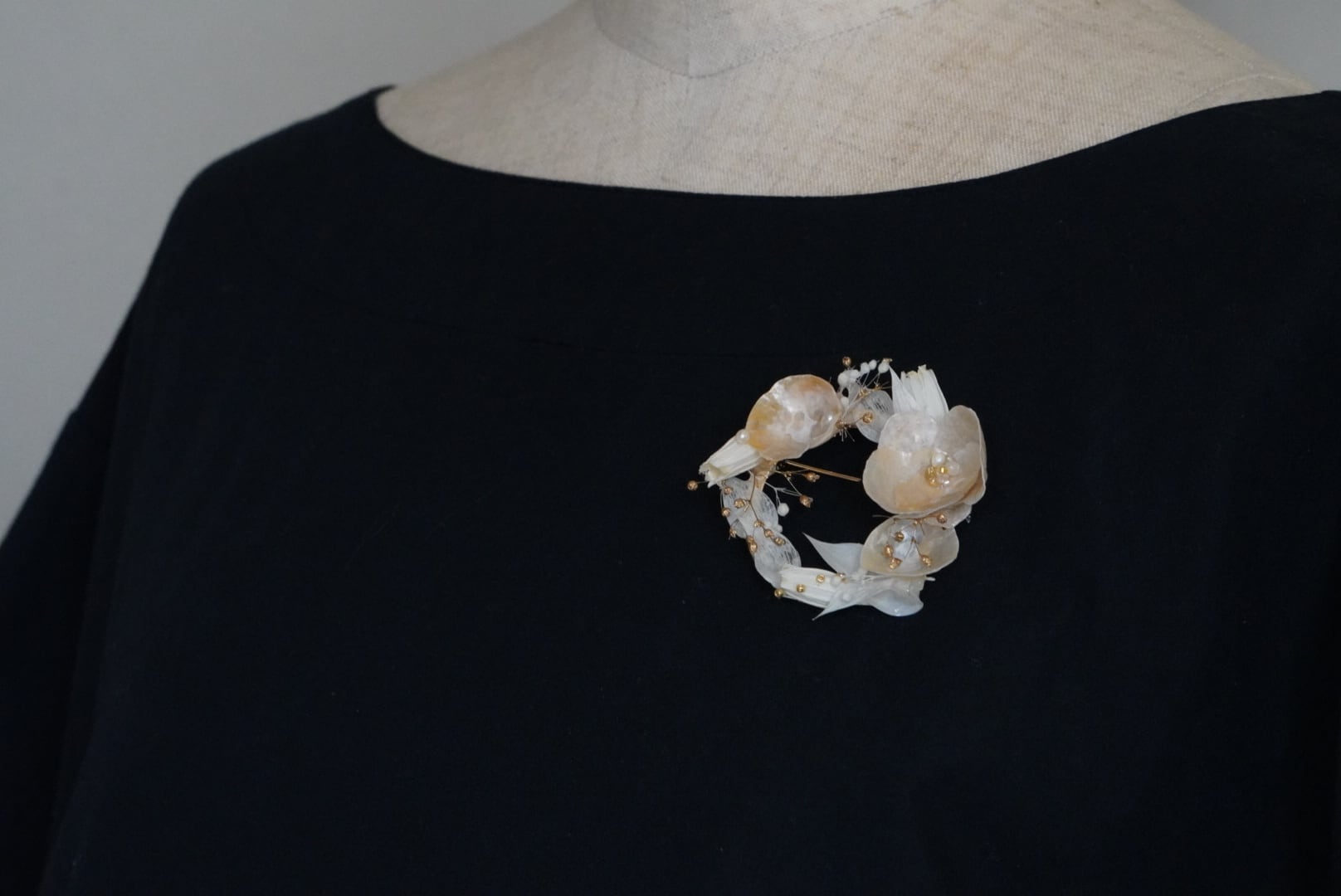 貝殻とドライフラワーなどの花材を組み合わせたブローチです。