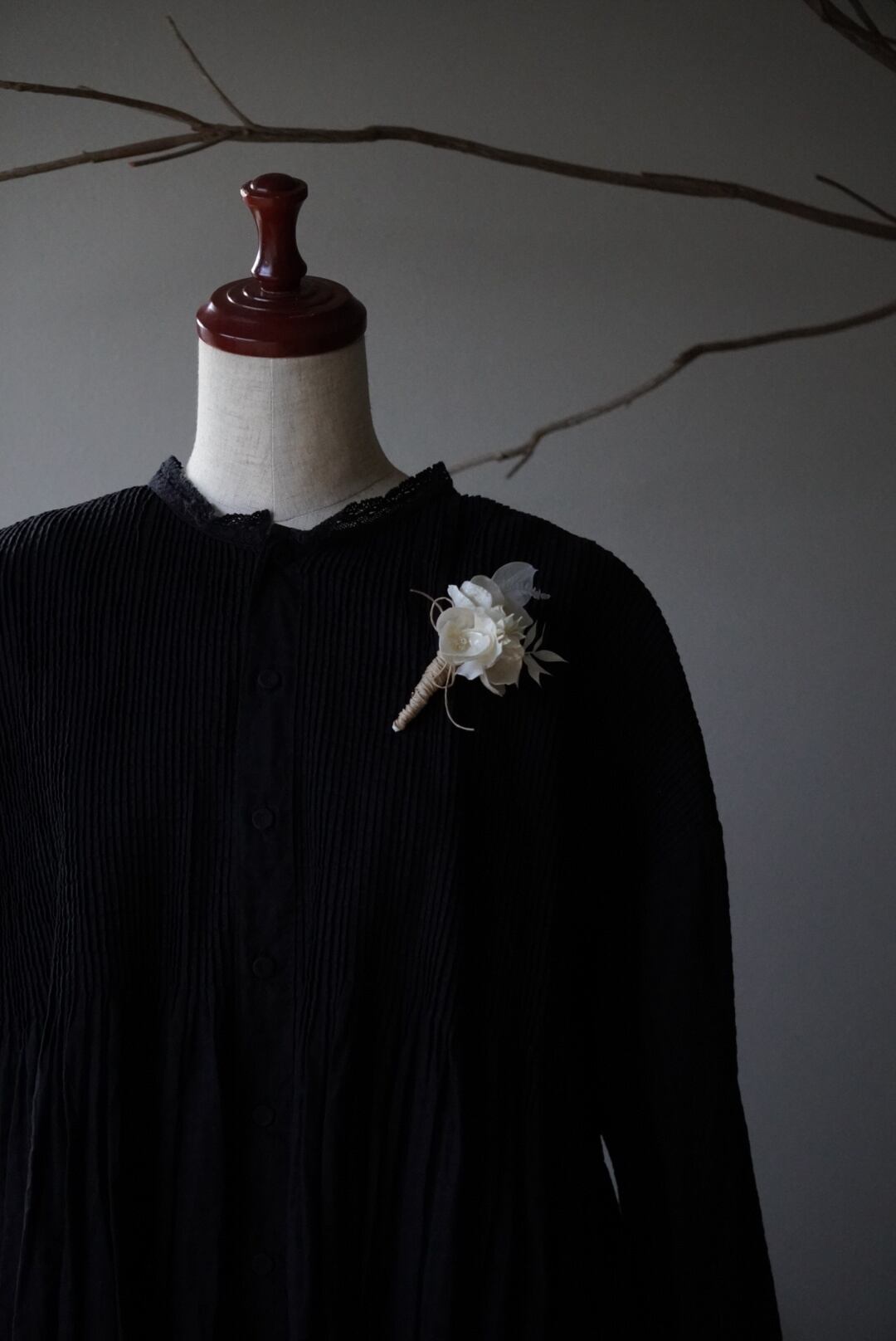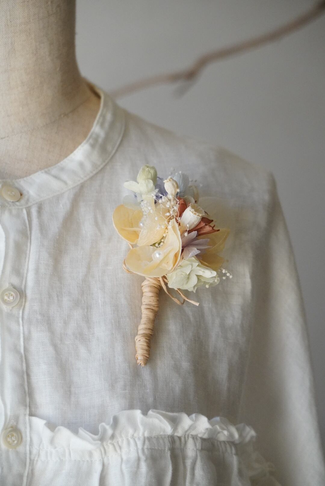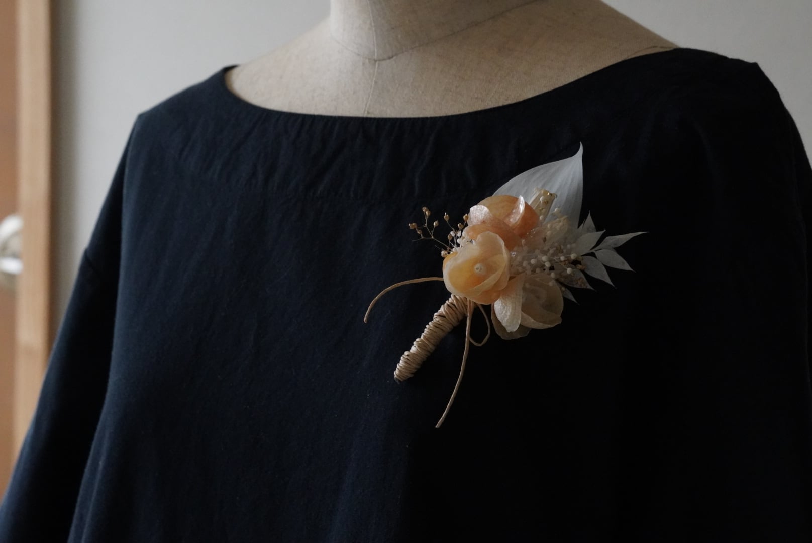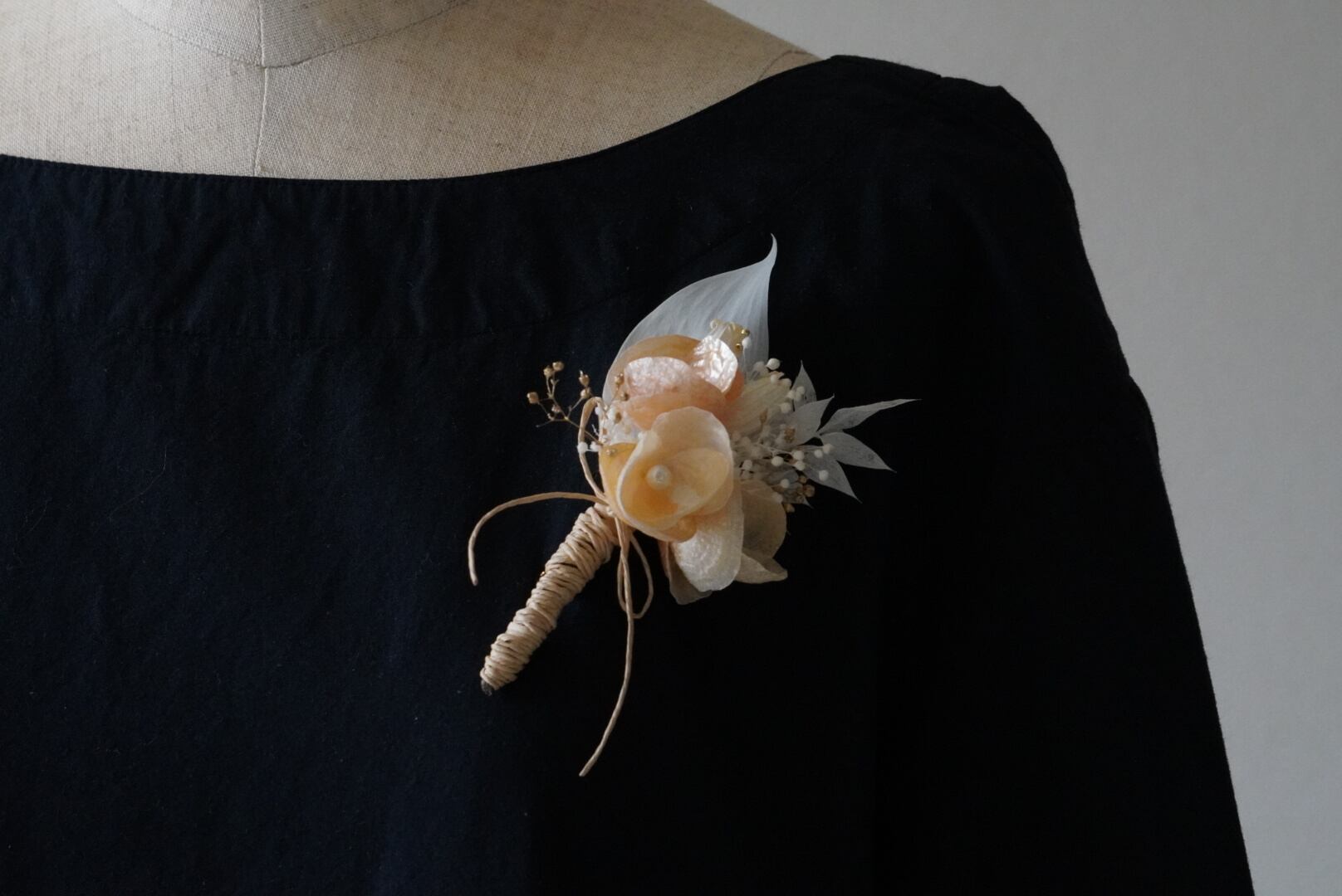 後ろにブローチピンが付いています。小さな花束のようなセレモニー向けのコサージュです。小瓶に生けて小さなインテリアとしてもお楽しみ頂けます。